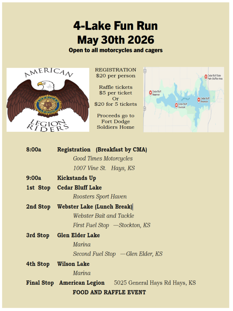 The 2026 Kansas Legacy Run will begin in Junction City on 12 June and end in Dodge City on 14 June 2026. We’ll visit posts in Emporia, El Dorado, Mulvane, Great Bend and Dodge City, and memorials in Winfield, Anthony, Barber Co, Pratt, and South Hutchinson. Highlights also include wreath layings and very special stops at the Winfield Veterans Home and the Kansas Soldiers Home at Fort Dodge.